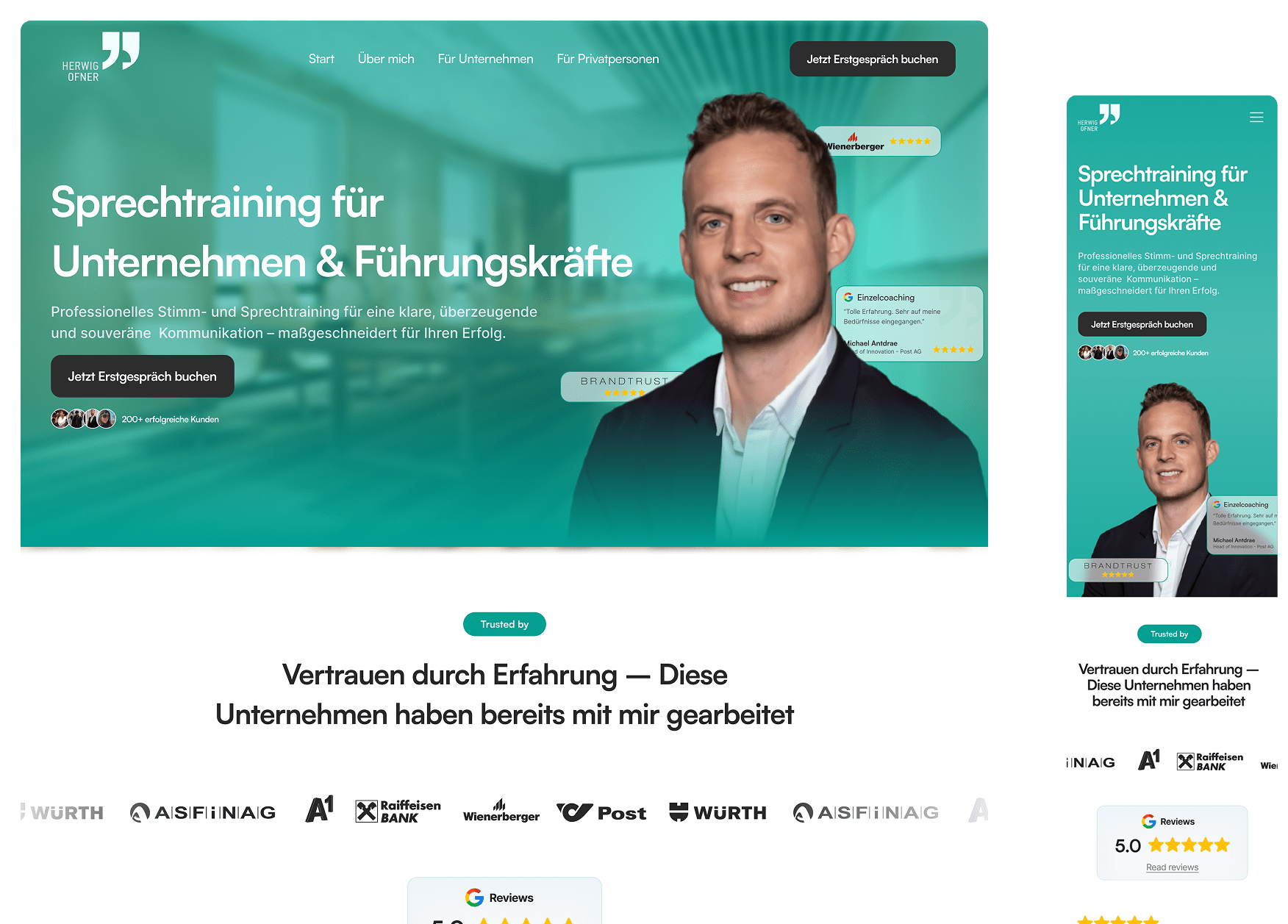 Wir haben die neue Website von Herwig Ofner entworfen, um seine Erfahrung und Persönlichkeit auf eine Weise zu präsentieren, die sowohl professionell als auch nahbar wirkt. Das Ziel war einfach: Ihn als vertrauenswürdigen Coach für Führungskräfte, Teams und Einzelpersonen in ganz Österreich hervorzuheben.